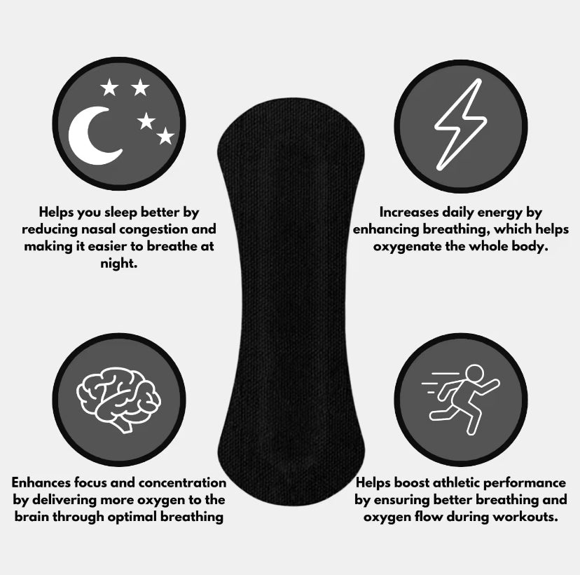 Tiras nasales diseñadas para mejorar la respiración de forma natural. Al abrir suavemente las fosas nasales facilitan el flujo de aire, ayudando a reducir ronquidos, mejorar el descanso y aumentar el rendimiento durante el deporte. Son cómodas, discretas y fáciles de usar, sin fármacos ni químicos.